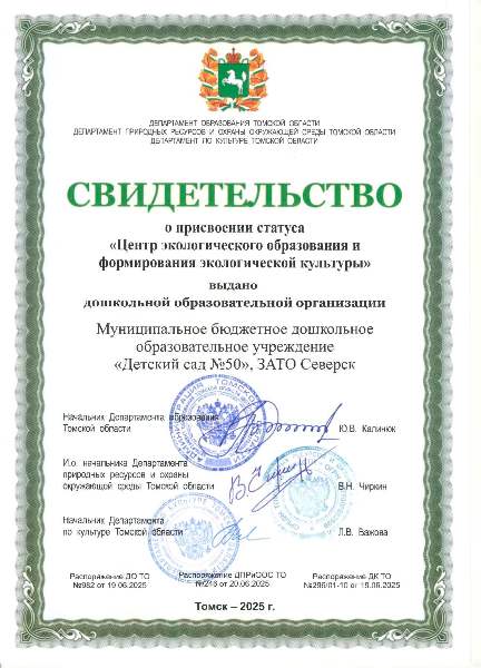 Статус: «Центр экологического образования и формирования экологической культуры», г. Томск (распоряжение Департамента образования Томской области № 982 от 19.06.2025 г. "О присвоении статуса Центра экологического образования и формирования экологической культуры на 2025 - 2030 годы"). Дата начала: 19.06.2025 Дата окончания: 2030 Количество участников: 37 Планируемы изменения: Комплексные Планируемый результат: - создание условий для непрерывного экологического образования дошкольников; - воспитание маленького гражданина – гуманной, социально-активной личности, способной понимать и любить природу, чувствовать себя ее частью, бережно и ответственно относиться к окружающему миру и к своему здоровью; - разработка и совершенствование нормативно-правовой, методической и материально-технической базы центра экологического образования и формирования экологической культуры, с целью организации непрерывного экологического образования дошкольников; - разработка и внедрение программ по формированию экологической культуры для детей дошкольного возраста; - повышение квалификации педагогических работников в области экологического образования; - повышение эколого-педагогической компетентности педагогов и родителей;