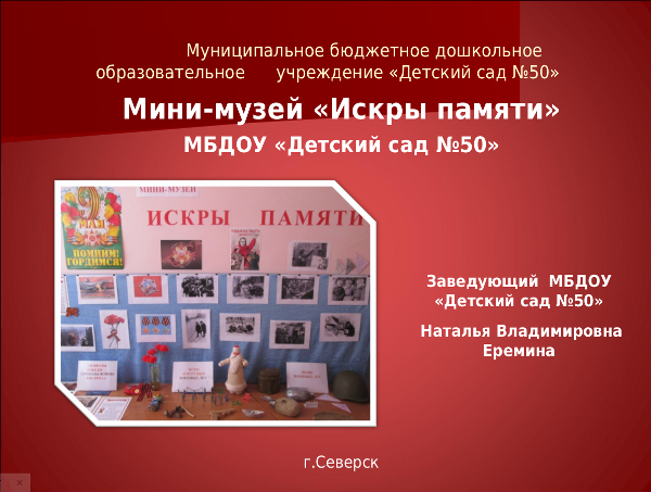 На современном этапе развития мирового политического сообщества происходят недопустимые тенденции: искажение истории политиками некоторых государств; утрата значимости победы Советского Солдата-освободителя в Великой Отечественной Войне и освобождения ряда стран от нацизма; снижение уровня духовности, нравственности и патриотизма среди современной молодежи. В контексте реализации ФГОС ДО и ФОП ДО, необходимо создавать соответствующую развивающую предметно-пространственную, в том числе, направленную на воспитание у дошкольников гражданско-патриотических, духовно-нравственных качеств. С этой целью, в МБДОУ «Детский сад №50» было решено создать мини-музей «Искры памяти». Этот музей позволил объединить силы педагогов, детей и их родителей.